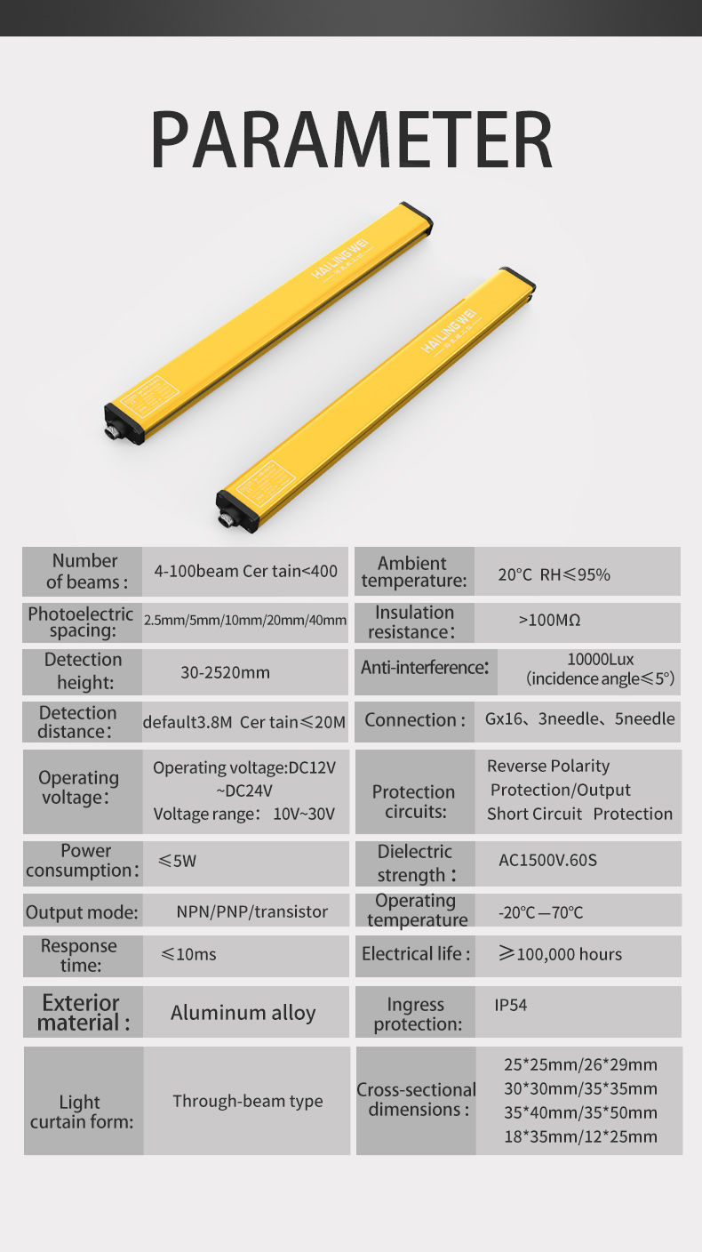 Light curtain form | Through-beam type | Cross-sectional dimensions | 25*25mm/26*29mm/ 30*30mm/35*35mm/ 35*40mm/35*50mm/ 18*35mm/12*25mm |